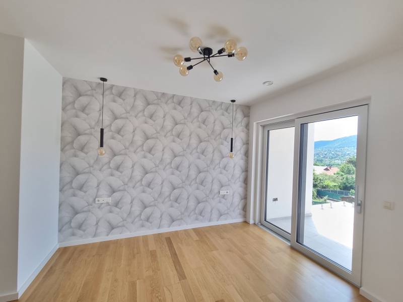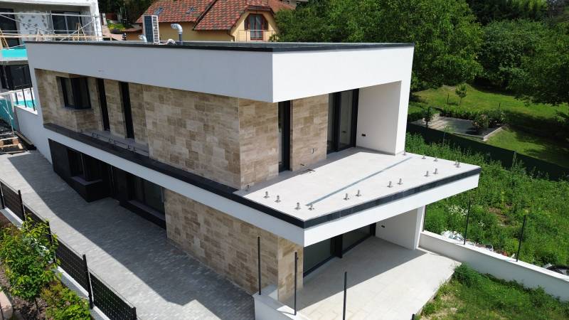3.ker, Aranyhegyen, jól megközelíthető helyen aszfaltos utcában, panorámás , PRÉMIUM katgóriás 170 m2-es, nappali + 4 szobás +2 félszobás családi ház, nagy múltú beruházótól , dupla garázzsal eladó.A telken 3 db külön álló , szeparált családi ház található.A teljes ház prémium anyagokkal lett megépítve, mind a külső mind a belső tekintetében.Belső építész által tervezett koncepció alapján kerültek kiválasztásra a kiváló minőségű burkolatok, prémium szaniterek és egyedi gépesített konyhabútor.A ház teljesen elkészült, azonnal költözhető. Használatbavétellel is rendelkezik.Az ingatlan fekvése délnyugati, így egész nap világos.Földszinten található:Előtér, vendégszoba/dolgozószoba, zuhanyzó, gépészet-mosókonyha, amerikai konyhás nappali.Emeleten:Közlekedő, 1 master bedroom saját fürdővel és gardróbbal, 2 további hálószoba, 1 fürdőszoba.A ház paraméterei:- nettó lakótér: 131m2- teraszok: 42m2- dupla garázs: 36m2 (benne van az árban)Műszaki tartalom:- Gépészet: hőszivattyú, melegvíz tartállyal, mennyezet fűtés és hűtés, padlófűtés.- Szellőztető rendszer, párásítással és szárító funkcióval.- Vízlágyító.- Konyhai szellőzés tető fölé vezetve.- Elektromos törölköző szárító radiátoroknak kiépítés.- Kertben kerticsapnak kiállás.- Szülői háló teraszán elektromos és gépészeti kiállás jakuzzinak.- Okosotthon rendszer kiépítve. TAP Home rendszer.- Külső elektromos kiállások.- Hofstädter prémium ablakok és bejárati ajtó, zsalúzia minden ablakon.- Prémium belső burkolatok, a parketta mindenhol szalagparketta (Bécsi parketta) – nem laminált.- Belső nyílászárók valódi fa furnérozott ajtók (Porta door), nem fóliázott ajtók.- Szaniterek (kád, zuhany, mosdók, wc-k), prémium márkák (Grohe, Ravak), a mosdószekrények is beépítésre kerültek.- A riasztó rendszernek kiépítve a kábelezése, a nyílászárókban nyitásérzékelő kiépítve.- Teraszokon Üvegkorlát került elhelyezésre mindenhol.- Az összes belső lámpa beépítésre került.- A konyha is beépítésre került, a hűtő kivételével az összes gépet is tartalmazza.- Külső homlokzatra Travertin és Antracit Brazil pala kőburkolat került felhelyezésre.- 15 cm – grafitos hőszigetelés a falakon és erkélyeken.- Tetőn 22cm + hőszigetelés. A padló alatt 12 cm hőszigetelés.A kiváló energetikai tulajdonságoknak köszönhetően az üzemeltetési költségek rendkívül alacsonyak!VÁROM HÍVÁSÁT, AKÁR HÉTVÉGÉN IS, MINDEN NAP REGGEL 8-TÓL ESTE 10-IG. |