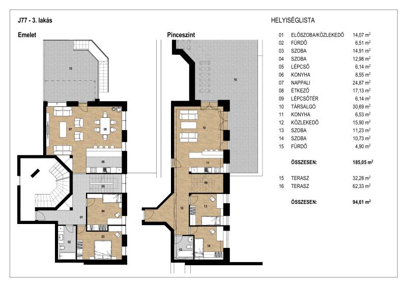 3.kerület, Testvérhegyen, kiváló közlekedésénél, mégis csendes helyen,igényes házak környezetében, 3 lakásos EXKLUZÍV 2023-ban épülttársasházban, 1. emeleti, nagyon tágas, csodálatos, elvehetetlenpanorámával rendelkező, belső 2 szintes, nappali + 4 szobás,duplakomfortos, 62 m2-es panorámás teraszos (jakuzzi elhelyezésérealkalmas), saját 300 m2-es kertrésszel (úszómedence kialakítható)rendelkező öröklakás, rengeteg extrával eladó.A társasház 2023-ban került átalakításra. Egy villaépületből bővítésselalakítottak ki, 1150 m2-en, 3 db exkluzív nagyméretű lakást, 6 db fűtöttlejáratú gépkocsibeállót a teremgarázsban, felszíni beállókat és 3 dbnagyméretű tárolót.Az épület teljesen új külsőt kapott, csak a tartószerkezetek maradtak meg.Teljeskörű átépítés történt, falak, tetőrendszer, szigetelések, vezetékek, fűtésrendszer, vízvezetékek,burkolatok, nyílászárók teljesen újak.Az épület egy 2400 m2-es telken helyezkedik elLakás nettó négyzetméter: 185,05 m2terasz: 32,28 m2 panorámásterasz: 62,33 m2saját kertrész: 300 m2Helyiséglista:emelet:• nappali-konyha-étkező: 50,55 m2• előszoba: 14,07 m2• szoba: 14,91 m2• szoba: 12,98 m2• lépcsőtér: 6,14 m2• fürdőszoba: 6,51 mFölszint:• szoba/nappali: 30,69 m2 kertkapcsolatos• szoba: 11,23 m2• vendégszoba: 10,73 m2• fürdőszoba: 4,90 m2• közlekedő: 15,90 m2• lépcsőtér: 6,14 m2Műszaki leírás:- 36cm-es tégla falazat- 15 cm vastagságú grafitos, Drywith hőszigetelés- 3 rétegű, műanyag Hofstadter, hőszigetelt nyílászárókFűtéstechnika:- Daikin hőszivattyús fűtés- padlófűtés- fancoilSzaniterek:RavakÁrnyékolás:zsalúzia opcionálisKonyhabútor:- Nobília, német csúcsminőségű konyhabútor- Bosch gépekkel- konyhaszigetExtrák:- Chameleon okosotthon rendszer (mobiltelefonról irányítható)- dekorfal- igényes beltéri ajtók- nagyértékű, vízálló Vynil padlóburkolatA lakáshoz tartozik: a teremgarázsban 2 db gépkocsibeálló, melynek ára: 10 millió Ft/beállófelszíni beálló 2 db, melynek ára 4 millió Ft/beállótároló: 17 m2 7 millió Ftösszesen: 35 millió Ft, melyeknek megvásárlása kötelező.lakás ára: 310 millió FTösszesen: 345 millió FtAmennyiben felkeltette érdeklődését az ingatlan, várom hívását, akár HÉTVÉGÉN is! |