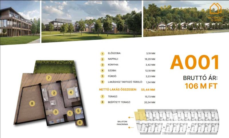 Balatonföldvár: Balatonföldvár fontos turisztikai célpont, nemcsak a magyarok, hanem más európai országok turistái számára is, természeti szépségei (például a löszhegy és a nagy virágos parkok), továbbá történelmi örökségei (például a kelta ösvény, a régi kúriák és villák) miatt számtalan szabadidős lehetőséget, valamint számos vízi sportot (vitorlázás, szörfözés, horgászat, evezés)Balaton liget willapark:Lakások száma: 56 db.Alapterület: 28-56 m².A földszinti lakásokhoz saját, privát kert tartozik.A földszinten 21 lakás található, 48–110 m² közötti alapterülettel.Az első emeleten további 21 lakás érhető el, 47–75 m² közötti méretben.A második emeleten 17 lakás kapott helyet.A lakásokhoz önálló tárolóhelyiségek tartoznak, amelyek a közös folyosóról közelíthetők meg.Környezettudatos építő anyagokA+ energetikai besorolásFelszíni parkoló: 6.350.000. Ft.Modern letisztult építészet, tömegformálás, Balatonra tájolt panorámás teraszok.Apartmanlakás - alapfelszereltség:100% tömör CLT Ausztriából.20 cm kőzetgyapot hőszigetelés.Fa hőszigetelő nyílászárók 3 rétegű üvegezéssel,tölgyfurnér melegburkolat.Porcelán greslap hidegburkolat, villeroy fürdőszoba szaniterekpadlófűtés.Levegős hőszivattyú (VRV splitklíma), 50kW társasházi napelemrendszer, elektromos redőny, szúnyogháló beépített bútoroksaját terasz.A001. lakás.A további kérdésekkel és a megtekintéssel kapcsolatban kérem keressen a megadott mobil számon.