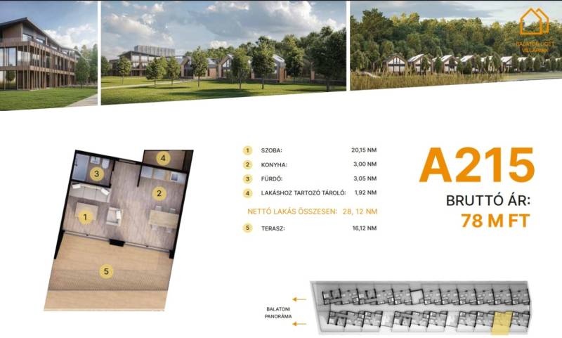 Balatonföldvár: Balatonföldvár fontos turisztikai célpont, nemcsak a magyarok, hanem más európai országok turistái számára is, természeti szépségei (például a löszhegy és a nagy virágos parkok), továbbá történelmi örökségei (például a kelta ösvény, a régi kúriák és villák) miatt számtalan szabadidős lehetőséget, valamint számos vízi sportot (vitorlázás, szörfözés, horgászat, evezés)Balaton liget willapark:Lakások száma: 56 db.Alapterület: 28-56 m².A földszinti lakásokhoz saját, privát kert tartozik.A földszinten 21 lakás található, 48–110 m² közötti alapterülettel.Az első emeleten további 21 lakás érhető el, 47–75 m² közötti méretben.A második emeleten 17 lakás kapott helyet.A lakásokhoz önálló tárolóhelyiségek tartoznak, amelyek a közös folyosóról közelíthetők meg.Környezettudatos építő anyagokA+ energetikai besorolásFelszíni parkoló: 6.350.000. Ft.Modern letisztult építészet, tömegformálás, Balatonra tájolt panorámás teraszok.Apartmanlakás - alapfelszereltség:100% tömör CLT Ausztriából.20 cm kőzetgyapot hőszigetelés.Fa hőszigetelő nyílászárók 3 rétegű üvegezéssel,tölgyfurnér melegburkolat.Porcelán greslap hidegburkolat, villeroy fürdőszoba szaniterekpadlófűtés.Levegős hőszivattyú (VRV splitklíma), 50kW társasházi napelemrendszer, elektromos redőny, szúnyogháló beépített bútoroksaját terasz.Kedvező fizetési konstrukció: 10-90 %.A 215. lakás.A további kérdésekkel és a megtekintéssel kapcsolatban kérem keressen a megadott mobil számon. |