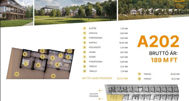 Balatonföldvár: Balatonföldvár fontos turisztikai célpont, nemcsak a magyarok, hanem más európai országok turistái számára is, természeti szépségei (például a löszhegy és a nagy virágos parkok), továbbá történelmi örökségei (például a kelta ösvény, a régi kúriák és villák) miatt számtalan szabadidős lehetőséget, valamint számos vízi sportot (vitorlázás, szörfözés, horgászat, evezés)Balaton liget willapark:Lakások száma: 56 db.Alapterület: 28-56 m².A földszinti lakásokhoz saját, privát kert tartozik.A földszinten 21 lakás található, 48–110 m² közötti alapterülettel.Az első emeleten további 21 lakás érhető el, 47–75 m² közötti méretben.A második emeleten 17 lakás kapott helyet.A lakásokhoz önálló tárolóhelyiségek tartoznak, amelyek a közös folyosóról közelíthetők meg.Környezettudatos építő anyagokA+ energetikai besorolásFelszíni parkoló: 6.350.000. Ft.Modern letisztult építészet, tömegformálás, Balatonra tájolt panorámás teraszok.Apartmanlakás - alapfelszereltség:100% tömör CLT Ausztriából.20 cm kőzetgyapot hőszigetelés.Fa hőszigetelő nyílászárók 3 rétegű üvegezéssel,tölgyfurnér melegburkolat.Porcelán greslap hidegburkolat, villeroy fürdőszoba szaniterekpadlófűtés.Levegős hőszivattyú (VRV splitklíma), 50kW társasházi napelemrendszer, elektromos redőny, szúnyogháló beépített bútoroksaját terasz.A 202. lakás.A további kérdésekkel és a megtekintéssel kapcsolatban kérem keressen a megadott mobil számon. |