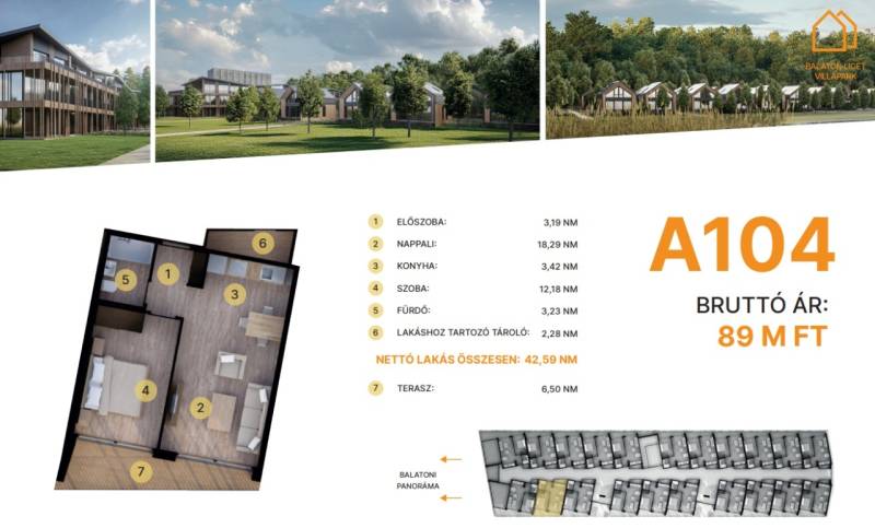 Balatonföldvár: Balatonföldvár fontos turisztikai célpont, nemcsak a magyarok, hanem más európai országok turistái számára is, természeti szépségei (például a löszhegy és a nagy virágos parkok), továbbá történelmi örökségei (például a kelta ösvény, a régi kúriák és villák) miatt számtalan szabadidős lehetőséget, valamint számos vízi sportot (vitorlázás, szörfözés, horgászat, evezés)Balaton liget willapark:Lakások száma: 56 db.Alapterület: 28-56 m².A földszinti lakásokhoz saját, privát kert tartozik.A földszinten 21 lakás található, 48–110 m² közötti alapterülettel.Az első emeleten további 21 lakás érhető el, 47–75 m² közötti méretben.A második emeleten 17 lakás kapott helyet.A lakásokhoz önálló tárolóhelyiségek tartoznak, amelyek a közös folyosóról közelíthetők meg.Környezettudatos építő anyagokA+ energetikai besorolásFelszíni parkoló: 6.350.000. Ft.Modern letisztult építészet, tömegformálás, Balatonra tájolt panorámás teraszok.Apartmanlakás - alapfelszereltség:100% tömör CLT Ausztriából.20 cm kőzetgyapot hőszigetelés.Fa hőszigetelő nyílászárók 3 rétegű üvegezéssel,tölgyfurnér melegburkolat.Porcelán greslap hidegburkolat, villeroy fürdőszoba szaniterekpadlófűtés.Levegős hőszivattyú (VRV splitklíma), 50kW társasházi napelemrendszer, elektromos redőny, szúnyogháló beépített bútoroksaját terasz.A 104. lakás.Kedvező fizetési konstrukció: 10-90 %.A további kérdésekkel és a megtekintéssel kapcsolatban kérem keressen a megadott mobil számon. |