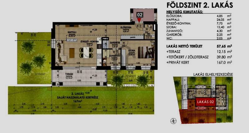Debrecen egyik legkedveltebb és legértékállóbb városrészén, a Nagyerdő lábánál, eladásra kínálok egy 6 lakásos, modern társasházat, amely a minőséget, a letisztult eleganciát és magas műszaki tartalmat képvisel.Az ingatlan prémium kivitelezéssel, korszerű műszaki megoldásokkal és átgondolt tervekkel készül.A társasház nyugodt, csendes környezetben helyezkedik el, mégis kiváló infrastrukturával a Nagyerdő közelsége különleges életérzést biztosít.A földszinti lakások egyedi arculata a tágas nappali, melyet a teraszra nyíló hatalmas hőszigetelt nagy ablak borítja, így a természet mindig karnyújtásnyira van.A társasház főbb jellemzői:- Az épület három szintre tagolható: pinceszint + földszint + emeleti szint- A pinceszinten 6 db. gépkocsi beálló valamint önálló tárolóhelyiségek található- Az épületben szintenként 3-3 kiválóan berendezhető lakás helyezkedik el- A lakásokhoz loggiák és teraszok kapcsolódnak- Csendes kertvárosias környezet- Parkosított zöld felületek a telkenLakások kialakítása:- Földszinti lakásokhoz saját kert, zöld terasz és fedett terasz tartozi.- Emeleti lakásokhoz loggiák tartoznak.Földszint 1 lakás: 69.3 nm + 12.15 nm terasz + 15 nm zöld terasz + 70 nm privát kertFöldszint 2 lakás: 57.65 nm + 12.15 nm terasz + 39.8 nm zöld terasz + 167 nm privát kertFöldszint 3 lakás: 69.75 nm + 12.15 nm terasz + 177 nm privát kertEmeleti lakások:Emelet 4 lakás: 69.35 nm + 11.35 nm loggiaEmelet 5 lakás: 57.65 nm + 11.35 nm loggiaEmelet 6 lakás: 69.75 nm + 11.35 nm loggiaMűszaki tartalom:- Prémium minőségű Pannontherm ALU-FA nyílászárók, extra nagyméretű emelő-toló erkélyajtókkal és üvegfelületekkel- Pannontherm - Stemeseder prémium Zsaluzia árnyékolás a nyílászárókkal harmonizáló színben- 3 rétegű hőszigetelt üvegezés- 20 cm vastagságú homlokzati szigetelés- Fan-coll hőszivattyús hűtés- Padlófűtéses hőleadás a lakás minden helyiségében- Levegő-víz hőszivattyús fűtés rendszer- Prémium anyaghasználatAz ingatlanokhoz tartozik gépkocsi beálló és tároló, melynek megvásárlása kötelező.A lakások CSOK Pluszra és hitelre alkalmasak.Amennyiben az ingatlan felkeltette érdeklődését, kérdése van, vagy szeretné megtekinteni, hétvégén is szívesen fogadom hívását! |