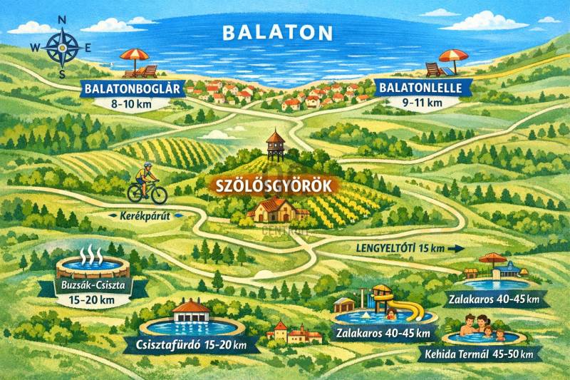 Szőlősgyörök és környéke – stabil vidéki befektetés a Balaton árnyékábanA Balaton déli partjának közvetlen vonzáskörzetében elhelyezkedő Szőlősgyörök az elmúlt években egyre inkább értékalapú ingatlanbefektetési célponttá válik. Szőlősgyörök a Balaton déli partjának feltörekvő vonzáskörzete, ahol a Balaton közelsége már értéket jelent, miközben az ingatlanárak még jelentősen kedvezőbbek, mint a vízparti településeken. Ideális választás családi ház, ikerház megvalósítására, illetve hosszú távú értékmegőrzésre a Balaton közvetlen közelében. Szőlősgyörök egy kis somogyi falu a Balaton déli partjától kb. 8–10 km-re délre, dombos-szőlős vidéken, Balatonboglár és Lengyeltóti irányában.Fonyód közvetlen közelében, rendezett, kertvárosias környezetben kínálunk megvételre egy 1040 m²-es, sík fekvésű építési telket, kiváló paraméterekkel és sokoldalú beépítési lehetőséggel.A telek 1040 m²-es, sík fekvésű , beépítésre szánt terület, 21 méteres utcafronttal rendelkezik, ami ideális alapot biztosít egy önálló családi ház, de akár ikerház megvalósításához is. A környéken jellemzően családi házak találhatók, a lakókörnyezet csendes, mégis jól megközelíthető.Főbb műszaki paraméterek:-Telek mérete: 1040 m²-Fekvés: sík terület-Beépíthetőség: 30%-Megengedett építménymagasság: 4,5 m-Utcafront szélessége: 21 m-Beépítési lehetőség: önálló családi ház vagy ikerház-Közművek: víz, villany, csatorna, gáz a telek előtt az utcánAmi igazán vonzóvá teszi:•nyugodt, kertvárosias környezet•jó adottságú, könnyen tervezhető telek•Fonyód és a Balaton gyorsan elérhető•ideális választás saját otthon építéséhez vagy befektetésnekEz a telek kiváló lehetőség mindazok számára, akik értékálló környezetben, jó szabályozási feltételek mellett szeretnének építkezni a Balaton déli partjának közelében.További információért és megtekintésért keressen bizalommal!#Fonyód #FonyódKörnyéke #Balaton #BalatonDélipart #BalatoniÉlet #BalatoniIngatlan #BalatonKözelében #EladóTelek #ÉpítésiTelek #LakóövezetiTelek #CsaládiHázÉpítés #Ikerház #Építkezés #SajátOtthon #ÚjOtthon #SíkTelek #JóBeépíthetőség #KözművesTelek #KertvárosiKörnyezet #NyugodtKörnyék |
