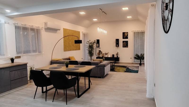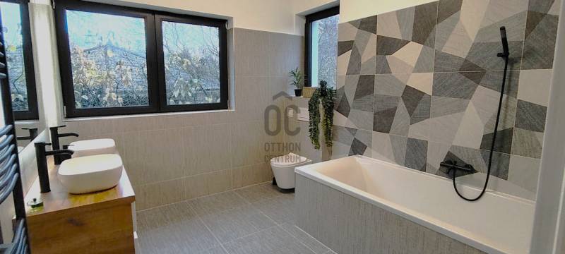 Fedezze fel ezt a kivételes lehetőséget Szentendre, Pismány városrészében, ahol egy új építésű, idén elkészült, modern ház várja Önt és családját.Az ingatlan a legmagasabb minőségi elvárásoknak megfelelően készült, közel 240 négyzetméteres alapterületén a nagyméretű világos nappalin, konyha-étkezőn, két fürdőszobán, mosókonyhán felül, 4 szoba és gardrób, plusz egy dolgozó sarok várja családjával.A nagyméretű, majdnem teljesen sík telken, ősfák és tudatosan telepített, gondozott örökzöldek, valamint a telek végében csordogáló patak adják a telek hangulatát. A békés, patakparti környezet, a madárcsicsergés, a friss levegő és a zöld panoráma, minden nap feltölti energiával, a tiszta, friss levegő sétára, futásra, túrázásra kerékpározásra csábítja.A ház tervezésekor, majd kivitelezése során a telek egyedi alaprajzának adottságait és meglévő növényzetének megóvása mellett az új növényzet telepítése is kiemelt szerepet kapott. Az újépítésű, Ytong falazatú, hőszivattyús fűtésrendszerrel ellátott épület, korszerű hőszigeteléssel, nyílászárókkal és energiatakarékos megoldásokkal biztosítja a kellemes klímát és az alacsony fenntartási költségeket egész évben. A zöldre néző nagy üvegfelületek beengedik a fényt, miközben a tágas, kertkapcsolatos nappali, a stílusos étkezővel és a nagyméretű terasszal a kényelmet és az eleganciát ötvözik.Több, mint 1000 négyzetméteres telkével ideális választás mindazok számára, akik a városi élet nyüzsgésétől távol, mégis könnyen megközelíthető helyen szeretnének élni. Az ingatlanban öt tágas szoba található, amelyek lehetőséget adnak a családi életre, valamint vendégek fogadására. A két fürdőszoba kényelmet biztosít a mindennapok során, így a reggeli rohanásban sem kell kompromisszumot kötnie. A közel 50 négyzetméteres terasz tökéletes helyszín a pihenésre, ahol élvezheti a gyönyörű panorámát, amely a környék varázsát tükrözi. Az újépítésű ingatlan a hőszivattyús fűtés és a klímaberendezés pedig garantálja a kellemes hőmérsékletet télen és nyáron egyaránt. A garázsban egy autó kényelmesen parkolhat, ezen felül a telken további két autó is elfér, így nem kell aggódnia a parkolási lehetőségek miatt.A környék csendes és biztonságos, ideális választás családok számára. Szentendre számos lehetőséget kínál a szabadidős tevékenységekre, legyen szó kirándulásokról, kerékpározásról vagy a helyi éttermek és kávézók felfedezéséről vagy kulturális élményekről, eseményekről. A közlekedési lehetőségek is kiválóak, hiszen a város könnyen megközelíthető autóval, de a tömegközlekedés is jól kiépített, így Szentendre és Budapest között gyorsan és kényelmesen közlekedhet. A családbarát ingatlan a természet nyugalmát és a városi kényelem közelségét kínálja, egyszerűen megközelíthető, csendes utcában, mégis percekre a városközponttól, óvodától, iskoláktól, üzletektől és tömegközlekedéstől.Ez az ingatlan nemcsak egy otthon, hanem egy életstílus megtestesítője, amely lehetőséget kínál az aktív, de mégis nyugodt életvitelre. |