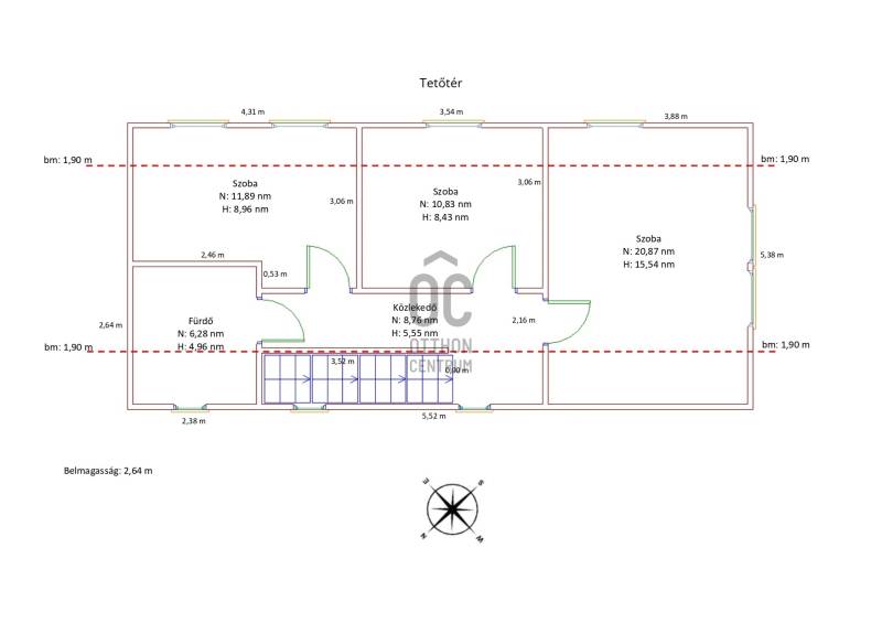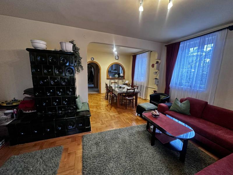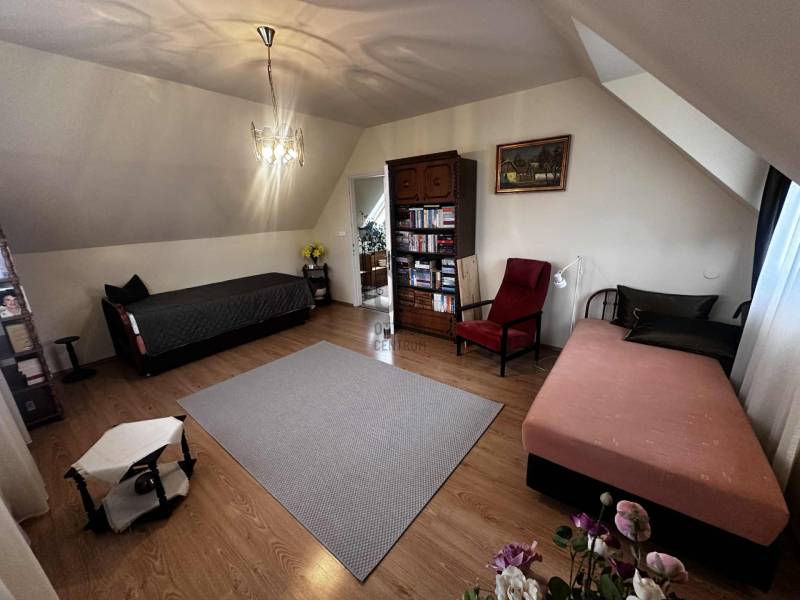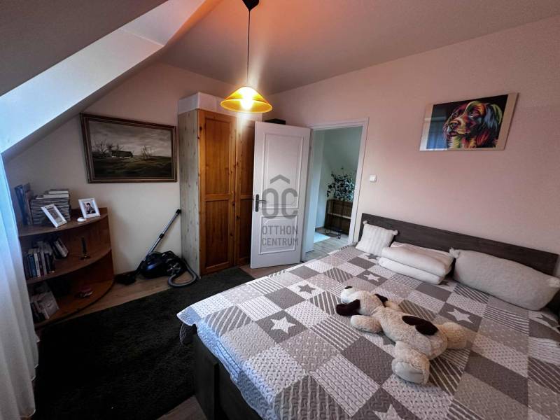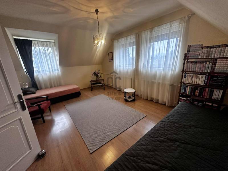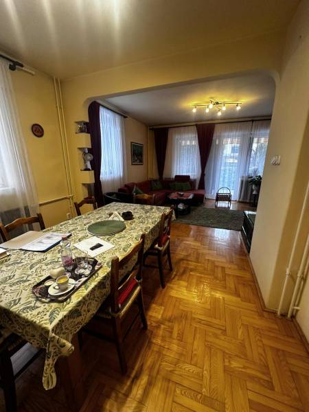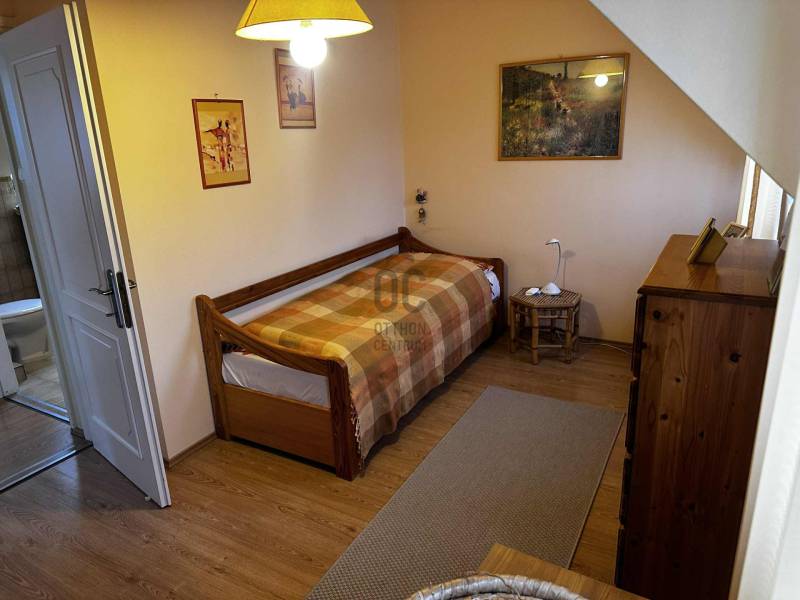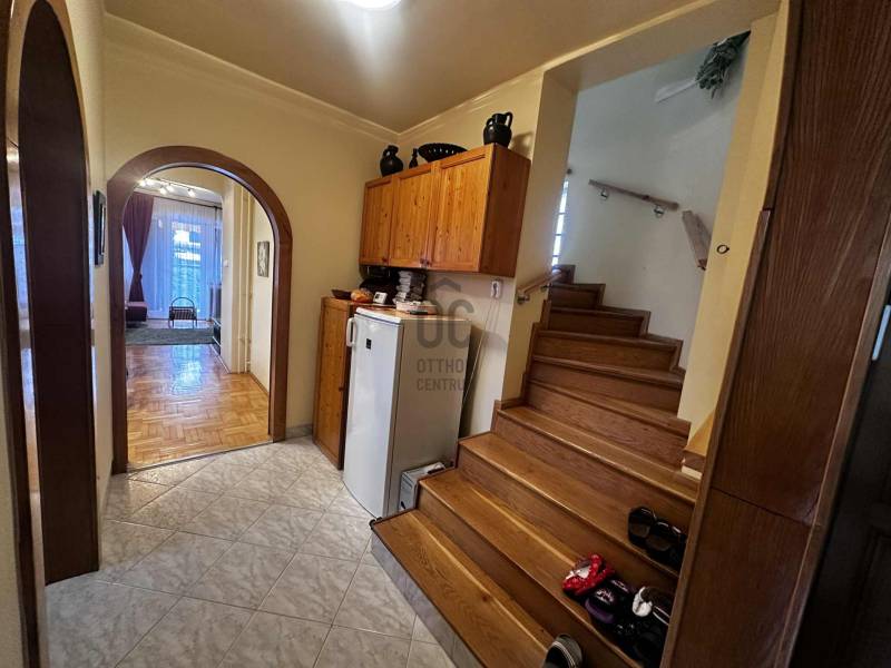 Budapest II/A kerület Pesthidegkút városrészben kínálunk egy nagyon jó alapadottságokkal rendelkező ikerházfelet.Az Üvegház utcai ingatlan, a Hidegkúti útról 8-10 perc sétatávolságra elérhető.-A téglából épült családi otthon 1989-ben épült-394 m2 telek tartozik hozzá-3 szintes (szuterén, félemelet, tetőtér)-A ház jól karbantartott, de felújítás, korszerűsítés nem történt az építés óta, így a jobb energetikai hatékonyság érdekében, teljes felújítás szükséges.A kapun belépve 4 lépcsőfokon jutunk be a házba. Az előszoba (6.88m2) és közlekedő (5.62m2) kényelmes méretű, a beépített szekrénybe cipők és a kabátok is jól elférnek. Innen balra léphetünk a konyhába, amely ablakos az utca felé és egy átadó pulttal az étkező felé is nyitott. A közlekedőből az étkező és nappali szobába léphetünk, amelynek éke egy szép, fatüzelésű cserépkályha. A nappaliból kiléphetünk a 21m2-es teraszra, innen pedig lesétálhatunk a kertbe. A földszinten továbbá egy wc és mosdó is helyet kapott és innen indul a világos lépcsőház is mint a szuterén, mint a tetőtér irányába.A tetőtérben a közlekedőből (5.55m2) 3 hálószoba (8.96m2, 8.43m2, 15.54m2) és egy kádas fürdőszoba (4,96m2) nyílik.A szuterén szint egyik legnagyobb előnye, hogy akár teljesen szeparálva, külön bejárattal rendelkezik!!! így akár két generáció is tud együtt élni a házban. (korábban volt is így használva) De alkalmas lehet akár otthoni irodának, műhelynek, hobby, vagy torna helyiségnek is. Ezen a szinten található a kazánház is. A ház melegét a cserépkályhán kívül, a 2018-ban kicserélt Bosch gázkazán biztosítja. A lakószobán túl (22.4 m2) egy zuhanyzós fürdőszoba (3,51m2) és 3 további helyiség is található ezen a szinten (5.2m2, 4,38m2, 1m2) melyből a legnagyobbat korábban teljesértékű konyhaként is használtak, ma csak tárolóként funkcionálnak.Közvetlenül a ház mellett, egy 16.6m2-es zárt garázs, előtte pedig egy fedett gépkocsibeálló is kialakításra került. A kertben egy betonalap is megtalálható, ami korábban egy medencének adott helyet.Nagyobb családoknak kiváló lehetőség lehet ez a ház. Felújítás után, egy igazán jól használható családi otthon varázsolható belőle.(Fontos, hogy az ingatlan jogilag lakóházként van nyilvántartva, de ikerházas kialakítása okán, az otthon start 3%-os hitelt nem lehet rá igényelni, mert a falai összeérnek.)Várom érdeklődését |