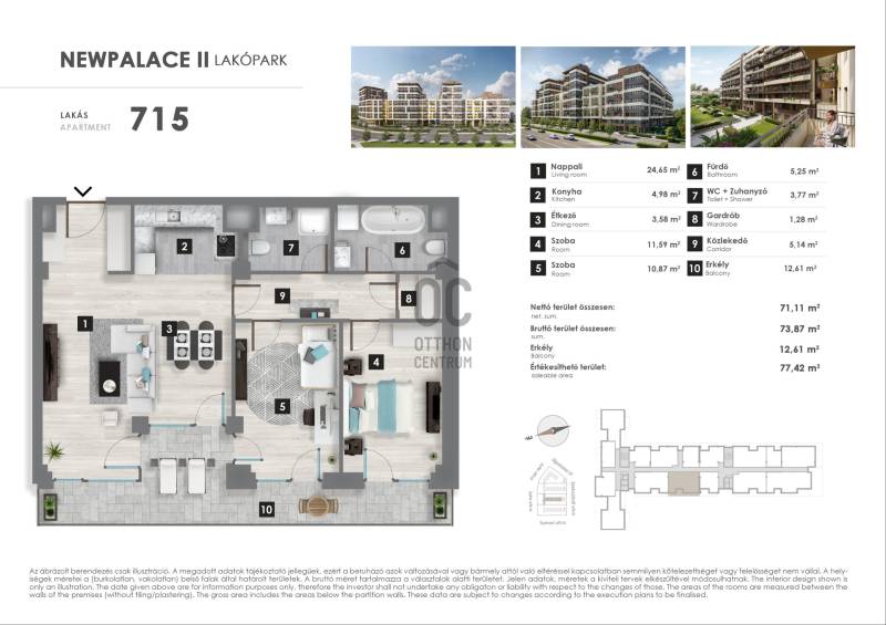 Projekt bemutatásaNew Palace II. ütemA New Palace a XIII. kerület csendes részén épül. A megújult kertvárosias környezet a pesti oldal egyik legkedveltebb részei közé tartozik, az itt élők egyszerre élvezhetik a csöndes kis utcák nyugalmát és a belváros közelségét.A társasház különleges, extravagáns homlokzatával egyedi fiatalos dizájnjával, kiemelkedik a környező épületek közül és ezáltal lesz majd sokáig a környék ismert és meghatározó tájékozódási pontja. A már eddig is komoly fejlődésen és megújuláson átesett városrész a projekt megvalósulásával beírja magát a kerület új városrészei közé.A földszint + 12 emelet magas épületet elegáns, kertépítők által tervezet parkok veszik körül, megreformálva a társasház környezetét is. A zárt, csak a társasház lakói által megközelíthető udvaron fákkal, cserjékkel tarkított, füvesített zöldkert kerül kialakításra.A lakások két elegáns, egymástól elkülönülő lobbyn keresztül közelíthetőek meg, lépcsőházanként két-két lifttel. A lakáskínálatban az egyszobás lakástól egészen a négyszobásig mindenféle elosztású megoldás megtalálható, a kínálatban alig van két egyforma lakás. Minden lakás rendelkezik erkéllyel vagy terasszal, a földszinti és néhány exkluzív emeleti lakás pedig, intenzív zöldtetővel, saját kertrésszel.Figyelembe véve a jövő elvárásait, a társasház modern, környezetbarát, mennyezeti hűtő, -fűtő rendszerrel ellátott.Vevőinknek lehetőségük nyílik arra is, hogy megvásárolt otthonukat az utolsó részletig személyre szabhassák: módosítással élhetnek otthonuk elosztása tekintetében is, továbbá széles kollekcióból választhatnak meleg- és hideg burkolatokat. Az alapáras burkolatokon felül, elérhetőek feláras termékek is, mely biztosítja, hogy személyiségük otthonukban is vissza tükröződhessen.Az infrastruktúra is magáért beszél: a közeli Váci út kiváló közlekedése és bevásárlási lehetőségei, a megújult 3-as metró Gyöngyösi utcai megállója rövid sétával elérhető, hasonlóan az idilli hangulatú Gyöngyösi sétányhoz, mely a kerület egyik legkedveltebb részei közé tartozik. Szintén pár perc sétatávolságra a folyamatosan megújuló és minden igényt kielégítő Duna Pláza bevásárlóközpont (benne: SPAR, gyógyszertár, Rossmann, DM, Médiamarkt, tisztító, fodrászatok, virágbolt, Libri könyvesbolt, papír-írószerbolt és számos ruházati bolt. Kényelmesen megoldható a napi fogyasztási cikkek beszerzése is a nap bármely órájában a közvetlen közelben lévő Tesco áruházban és az üzletsoron lévő boltokban. A lakópark tágabb vonzáskörzetében de még mindig elérhető távolságban találjuk Újpest-központot, a Népszigetet és az Újpest vasútállomást.Irodánkban a legtöbb XIII. kerületi beruházás lakásai elérhetőek ügyfeleink számára.A jelen adatok tájékoztató jellegűek, ezért a Beruházó (sem a hirdető) azok változásával, vagy bármely attól való eltéréssel kapcsolatban semmilyen kötelezettséget, vagy felelősséget nem vállal.Az alaprajzokon ábrázolt berendezési tárgyak és bútorok, a burkolatok megjelenése nem képezi a szerződés tárgyát. A pontos felszereltségről a műszaki leírásban olvashat bővebben.Az aktuális lakáskínálatról és árakról érdeklődjön telefonon! |
