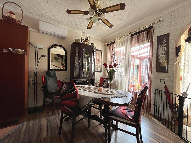 Óhegyen, csendes, családi házas övezetben kínálok megvételre egy 240 nm-es telken elhelyezkedő, 110 nm hasznos alapterületű, felújított családi házat. Az ingatlan 2+2 félszobás kialakítású, két fürdőszobával és mosdóval rendelkezik, így nagyobb család számára is kényelmes életteret biztosít.A ház fűtéséről gázkazán gondoskodik, de alternatív megoldásként kandalló és klíma is rendelkezésre áll. Összesen négy klíma került telepítésre, így minden helyiség hatékonyan hűthető és fűthető. Az energetikai korszerűsítés részeként 2020-ban napelemek kerültek a tetőre, ennek köszönhetően a rezsiköltség rendkívül kedvező, körülbelül 20.000 forint havonta. Legutóbbi energetikai minősítésen B besorolást kapott a rendkívül jól kialakított szigetelés miatt.Az ingatlan saját garázzsal rendelkezik, emellett az utcán a parkolás ingyenes. A házhoz elő- és hátsó kert is tartozik, valamint egy beépített, fűthető télikert, amely egész évben kellemes, világos plusz életteret biztosít. A kert gondozott, szép állapotú, ideális pihenésre és családi programokra.A délnyugati tájolásnak köszönhetően az ingatlan rendkívül világos.Elhelyezkedése kiváló, több buszjárat is könnyen elérhető, amelyek gyors kapcsolatot biztosítanak Kőbánya városközpont, Kőbánya-Kispest és a Puskás Ferenc Stadion irányába. Az Óhegy Park mindössze öt perc sétára található.Az ingatlan ideális választás családoknak és első lakásvásárlóknak, akik nyugodt környezetben, mégis kiváló közlekedés mellett keresik új otthonukat. |