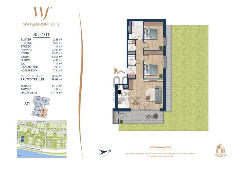 Projekt bemutatásaA projektrőlA Waterfront City egy új, modern városnegyed a 3. kerületben, ahol a természet közelsége és a városi kényelem tökéletes egyensúlyban van. A Duna-part közvetlen szomszédságában elhelyezkedő fejlesztés különleges atmoszférát kínál: a sétányt új épületek határolják, üzletekkel, kávézókkal és szolgáltatásokkal, amelyek élhető közösségi teret teremtenek.A 13 emeletes lakóépületből lenyűgöző örökpanoráma nyílik a budai hegyekre és a folyóra, a tágas teraszok pedig ideálisak a pihenéshez vagy a baráti összejövetelekhez. A zöldtetők, parkosított terek és fenntartható megoldások – mint az energiatakarékos rendszerek és okos otthon funkciók – mind hozzájárulnak a modern, környezettudatos életstílushoz.Látogass el értékesítési irodánkba, és tekintsd meg a városnegyed makettjét személyesen! Ismerd meg, milyen lesz az élet Budapest egyik legizgalmasabb új fejlesztésében!Óbuda szívébenKépzeld el, ahogy egy napsütéses délelőttön Óbuda szívében sétálsz, a Duna közelsége frissítően hat rád, miközben a Folyamőr utca, a Miklós tér és a Bogdáni út által határolt, öt hektáros területre érsz. A levegőben ott van a város történelme, mégis minden részletében a jövő hívogat.A 50 000 négyzetméteres területen egy hangulatos sétány vezet végig, amely egyenesen az óbudai Fő térre visz – mindössze 600 méterre. Ez a sétány nem csupán összeköt, hanem élményt nyújt: a Kolosy térről induló Óbudai Promenád részeként a város egyik legélhetőbb, legpezsgőbb szakaszán haladsz végig. És ha biciklivel érkeznél? A nemzetközi kerékpárút is itt halad el, Szentendre felé vezetve.Az 5. ütemben épülő 149 lakás mindegyike egyedi hangulatot kínál. Ahogy belépsz egy-egy otthonba, a hatalmas üvegfelületeken át beáradó fény és a tágas, szellős terek azonnal magukkal ragadnak. A kilátás? A Kaszap István park zöldje nyújt békét, míg a felsőbb emeletekről a Budai-hegység örökpanorámája tárul eléd – minden nap egy új festmény az ablakodban.A 6. ütemben 316 modern lakás épül, tágas teraszokkal és lenyűgöző kilátással a Dunára és a budai hegyekre. A lakók kényelmét őrszolgálat, kamerarendszer, mélygarázs, vendéglátóhelyek, belső park, játszótér és E-autó töltők szolgálják. Ez a projekt utolsó üteme, amely még közvetlen Duna-parti kapcsolattal rendelkezik.