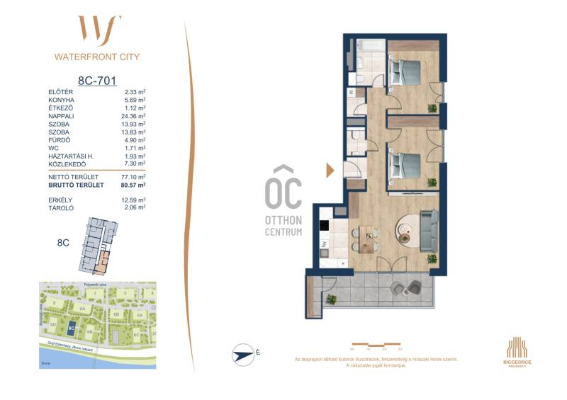 Projekt bemutatásaA projektrőlA Waterfront City egy új, modern városnegyed a 3. kerületben, ahol a természet közelsége és a városi kényelem tökéletes egyensúlyban van. A Duna-part közvetlen szomszédságában elhelyezkedő fejlesztés különleges atmoszférát kínál: a sétányt új épületek határolják, üzletekkel, kávézókkal és szolgáltatásokkal, amelyek élhető közösségi teret teremtenek.A 13 emeletes lakóépületből lenyűgöző örökpanoráma nyílik a budai hegyekre és a folyóra, a tágas teraszok pedig ideálisak a pihenéshez vagy a baráti összejövetelekhez. A zöldtetők, parkosított terek és fenntartható megoldások – mint az energiatakarékos rendszerek és okos otthon funkciók – mind hozzájárulnak a modern, környezettudatos életstílushoz.Látogass el értékesítési irodánkba, és tekintsd meg a városnegyed makettjét személyesen! Ismerd meg, milyen lesz az élet Budapest egyik legizgalmasabb új fejlesztésében!Óbuda szívébenKépzeld el, ahogy egy napsütéses délelőttön Óbuda szívében sétálsz, a Duna közelsége frissítően hat rád, miközben a Folyamőr utca, a Miklós tér és a Bogdáni út által határolt, öt hektáros területre érsz. A levegőben ott van a város történelme, mégis minden részletében a jövő hívogat.A 50 000 négyzetméteres területen egy hangulatos sétány vezet végig, amely egyenesen az óbudai Fő térre visz – mindössze 600 méterre. Ez a sétány nem csupán összeköt, hanem élményt nyújt: a Kolosy térről induló Óbudai Promenád részeként a város egyik legélhetőbb, legpezsgőbb szakaszán haladsz végig. És ha biciklivel érkeznél? A nemzetközi kerékpárút is itt halad el, Szentendre felé vezetve.Az 5. ütemben épülő 149 lakás mindegyike egyedi hangulatot kínál. Ahogy belépsz egy-egy otthonba, a hatalmas üvegfelületeken át beáradó fény és a tágas, szellős terek azonnal magukkal ragadnak. A kilátás? A Kaszap István park zöldje nyújt békét, míg a felsőbb emeletekről a Budai-hegység örökpanorámája tárul eléd – minden nap egy új festmény az ablakodban.A 6. ütemben 316 modern lakás épül, tágas teraszokkal és lenyűgöző kilátással a Dunára és a budai hegyekre. A lakók kényelmét őrszolgálat, kamerarendszer, mélygarázs, vendéglátóhelyek, belső park, játszótér és E-autó töltők szolgálják. Ez a projekt utolsó üteme, amely még közvetlen Duna-parti kapcsolattal rendelkezik.