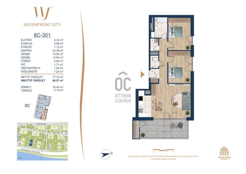 Projekt bemutatásaA projektrőlA Waterfront City egy új, modern városnegyed a 3. kerületben, ahol a természet közelsége és a városi kényelem tökéletes egyensúlyban van. A Duna-part közvetlen szomszédságában elhelyezkedő fejlesztés különleges atmoszférát kínál: a sétányt új épületek határolják, üzletekkel, kávézókkal és szolgáltatásokkal, amelyek élhető közösségi teret teremtenek.A 13 emeletes lakóépületből lenyűgöző örökpanoráma nyílik a budai hegyekre és a folyóra, a tágas teraszok pedig ideálisak a pihenéshez vagy a baráti összejövetelekhez. A zöldtetők, parkosított terek és fenntartható megoldások – mint az energiatakarékos rendszerek és okos otthon funkciók – mind hozzájárulnak a modern, környezettudatos életstílushoz.Látogass el értékesítési irodánkba, és tekintsd meg a városnegyed makettjét személyesen! Ismerd meg, milyen lesz az élet Budapest egyik legizgalmasabb új fejlesztésében!Óbuda szívébenKépzeld el, ahogy egy napsütéses délelőttön Óbuda szívében sétálsz, a Duna közelsége frissítően hat rád, miközben a Folyamőr utca, a Miklós tér és a Bogdáni út által határolt, öt hektáros területre érsz. A levegőben ott van a város történelme, mégis minden részletében a jövő hívogat.A 50 000 négyzetméteres területen egy hangulatos sétány vezet végig, amely egyenesen az óbudai Fő térre visz – mindössze 600 méterre. Ez a sétány nem csupán összeköt, hanem élményt nyújt: a Kolosy térről induló Óbudai Promenád részeként a város egyik legélhetőbb, legpezsgőbb szakaszán haladsz végig. És ha biciklivel érkeznél? A nemzetközi kerékpárút is itt halad el, Szentendre felé vezetve.Az 5. ütemben épülő 149 lakás mindegyike egyedi hangulatot kínál. Ahogy belépsz egy-egy otthonba, a hatalmas üvegfelületeken át beáradó fény és a tágas, szellős terek azonnal magukkal ragadnak. A kilátás? A Kaszap István park zöldje nyújt békét, míg a felsőbb emeletekről a Budai-hegység örökpanorámája tárul eléd – minden nap egy új festmény az ablakodban.A 6. ütemben 316 modern lakás épül, tágas teraszokkal és lenyűgöző kilátással a Dunára és a budai hegyekre. A lakók kényelmét őrszolgálat, kamerarendszer, mélygarázs, vendéglátóhelyek, belső park, játszótér és E-autó töltők szolgálják. Ez a projekt utolsó üteme, amely még közvetlen Duna-parti kapcsolattal rendelkezik.
