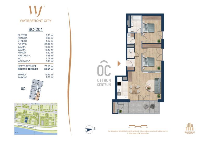 Projekt bemutatásaA projektrőlA Waterfront City egy új, modern városnegyed a 3. kerületben, ahol a természet közelsége és a városi kényelem tökéletes egyensúlyban van. A Duna-part közvetlen szomszédságában elhelyezkedő fejlesztés különleges atmoszférát kínál: a sétányt új épületek határolják, üzletekkel, kávézókkal és szolgáltatásokkal, amelyek élhető közösségi teret teremtenek.A 13 emeletes lakóépületből lenyűgöző örökpanoráma nyílik a budai hegyekre és a folyóra, a tágas teraszok pedig ideálisak a pihenéshez vagy a baráti összejövetelekhez. A zöldtetők, parkosított terek és fenntartható megoldások – mint az energiatakarékos rendszerek és okos otthon funkciók – mind hozzájárulnak a modern, környezettudatos életstílushoz.Látogass el értékesítési irodánkba, és tekintsd meg a városnegyed makettjét személyesen! Ismerd meg, milyen lesz az élet Budapest egyik legizgalmasabb új fejlesztésében!Óbuda szívébenKépzeld el, ahogy egy napsütéses délelőttön Óbuda szívében sétálsz, a Duna közelsége frissítően hat rád, miközben a Folyamőr utca, a Miklós tér és a Bogdáni út által határolt, öt hektáros területre érsz. A levegőben ott van a város történelme, mégis minden részletében a jövő hívogat.A 50 000 négyzetméteres területen egy hangulatos sétány vezet végig, amely egyenesen az óbudai Fő térre visz – mindössze 600 méterre. Ez a sétány nem csupán összeköt, hanem élményt nyújt: a Kolosy térről induló Óbudai Promenád részeként a város egyik legélhetőbb, legpezsgőbb szakaszán haladsz végig. És ha biciklivel érkeznél? A nemzetközi kerékpárút is itt halad el, Szentendre felé vezetve.Az 5. ütemben épülő 149 lakás mindegyike egyedi hangulatot kínál. Ahogy belépsz egy-egy otthonba, a hatalmas üvegfelületeken át beáradó fény és a tágas, szellős terek azonnal magukkal ragadnak. A kilátás? A Kaszap István park zöldje nyújt békét, míg a felsőbb emeletekről a Budai-hegység örökpanorámája tárul eléd – minden nap egy új festmény az ablakodban.A 6. ütemben 316 modern lakás épül, tágas teraszokkal és lenyűgöző kilátással a Dunára és a budai hegyekre. A lakók kényelmét őrszolgálat, kamerarendszer, mélygarázs, vendéglátóhelyek, belső park, játszótér és E-autó töltők szolgálják. Ez a projekt utolsó üteme, amely még közvetlen Duna-parti kapcsolattal rendelkezik.