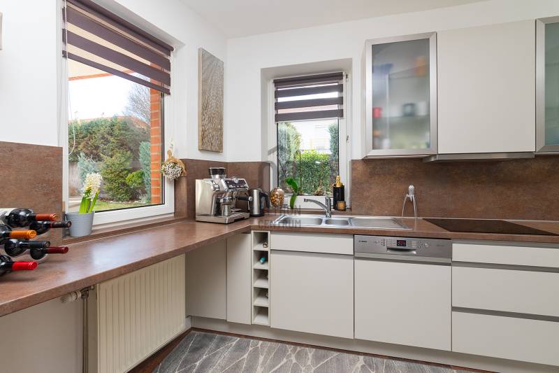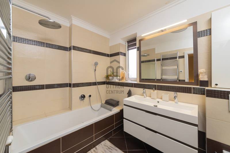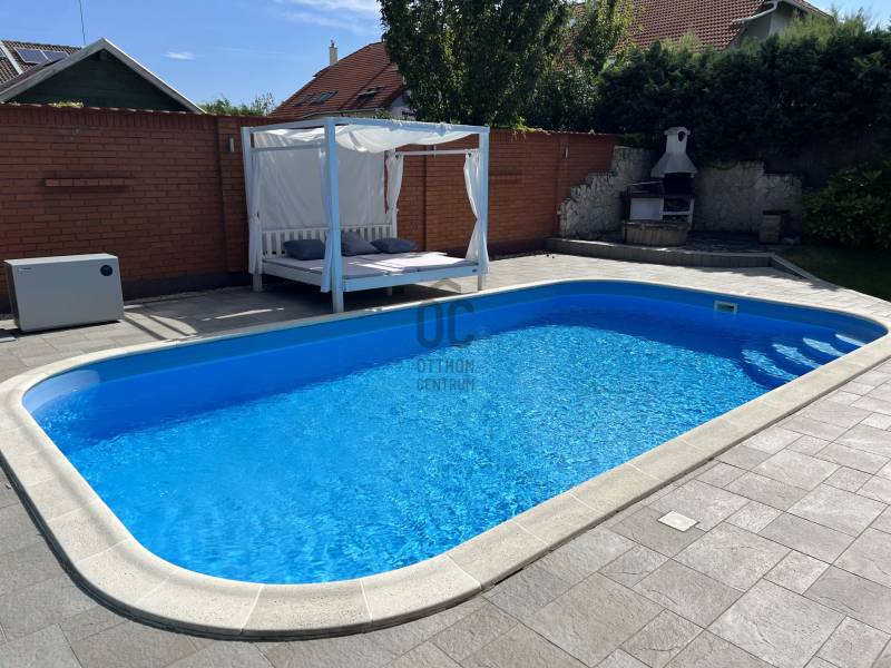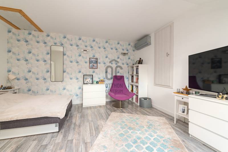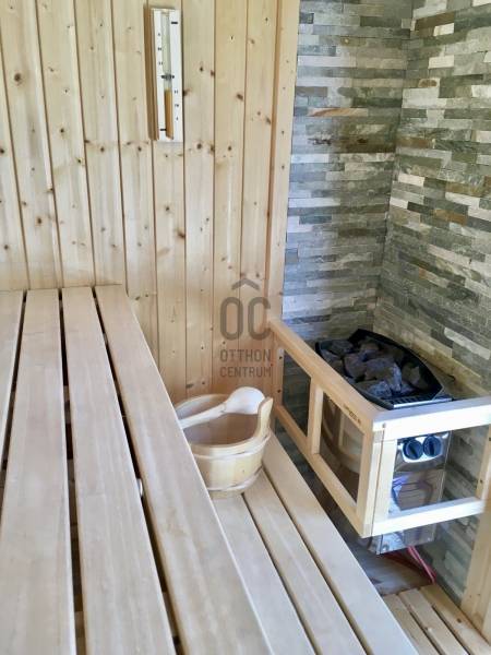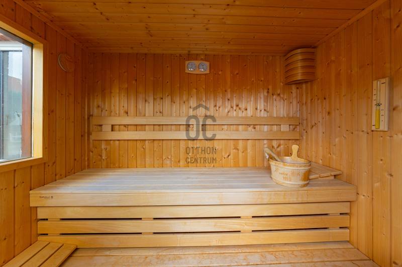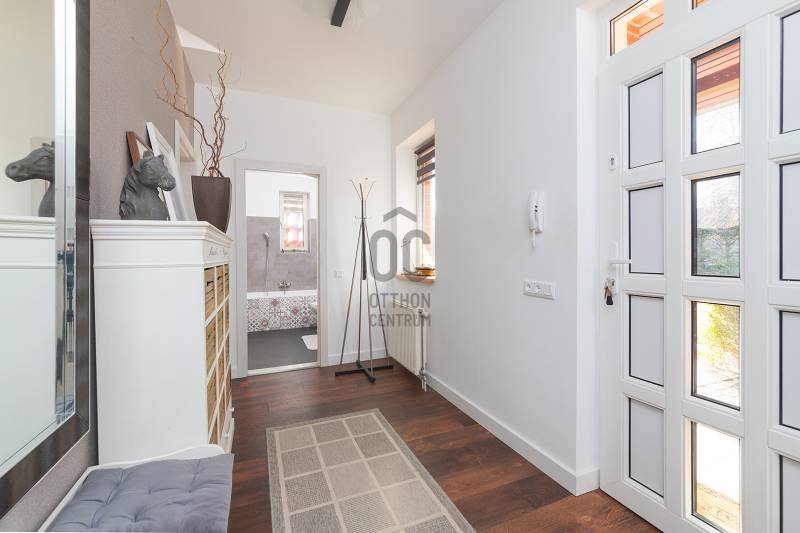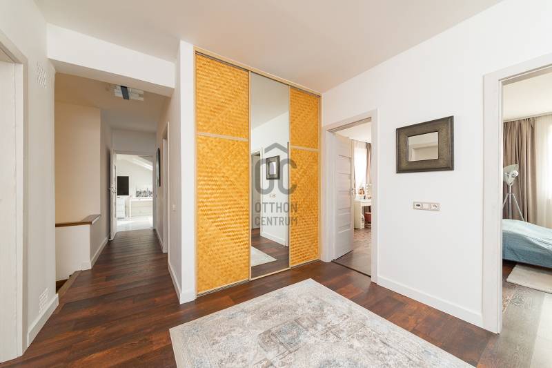XVII. kerületben a méltán kedvelt Pesti úti lakóparkban kínálunk megvásárlásra egy nappali+ 5 szobás, sok extrával felszerelt kiváló állapotú családi házat 605 nm-es telekkel. A lakóépület 2002-ben épült, azóta a Tulajdonosa esztétikailag és műszakilag is felújította, így a mai igényeknek maximálisan megfelel. A ház belső elosztása kiváló, nagyobb létszámú családnak, két generációnak is kényelmes Otthona lehet. A földszinten a tágas előszobából nyílik a felújított fürdőszoba, egy nagy méretű szoba, ez az egység külön lakrészként is funkcionálhat. A garázsból közvetlenül a lakásba jutunk. A ház központi része a közel 50 nm-es, napfényben úszó ( DK-i tájolás) nagyobb belmagasságú nappali az étkezővel, innen közvetlen kertkapcsolatunk van a nagy méretű teraszon keresztül. A konyhában új, gépesített (Bosch elektromos főzőlap, mosogatógép, sütő, mikró), német minőségi konyhabútor található, mely a vételár részét képezi. A nappaliban lévő fatüzelésű kandalló gondoskodik télen a meghitt hangulatról. Az emeletre kényelmes lépcső vezet, ahol négy tágas hálószoba, egy újszerű fürdőszoba és egy háztartási helyiség kapott helyet. Itt egy padlástéri helyiség még beépíthető, tárolásra kiválóan alkalmas. A mai energiaérzékeny világban fontos, hogy a rezsi ne legyen magas. Az ingatlan 10 KW-os napelemrendszerrel rendelkezik (még 7 évig szaldós), így a villanyszámla nulla. Elektromos autó töltő lett kiépítve, 5 db inverteres hűtő-fűtő klíma lett felszerelve, a fűtést és a használati melegvizet egy fiatal kondenzációs kazán biztosítja. Az ablakokban az üvegezés nemrég lett cserélve, továbbá a belső ajtókat is megújultak, modern, minőségi nyílászárók lettek beépítve. A hátsó, növényekkel körbeültetett intim kertben egy gépesített, épített medence került kialakításra napozóterasszal, a medence mérete 7,5 m x 4 m, hőszivattyú fűti a vizét.A medence mellett kapott helyet a 4 személyes finn szauna, továbbá kerti sütögető, bográcsozó is. A fűtött garázsban egy autó elfér, az előkertben további két autónak van hely, elektromos kapukon történik a bejutás, videós beléptető rendszer lett kialakítva. Az utcai kerítés cserélve lett porfestett alumínium kerítésre. A növényeket a 3 körös automata öntözőrendszer locsolja, a biztonságról riasztó gondoskodik. A környék kifejezetten szép, nívós, kulturált szomszédokkal, csendes kertvárosi környezet. Séta távolságra több bevásárlási lehetőség (Lidl, Spar), benzinkút, nagy játszótér, Home Centerben sok üzlet megtalálható, buszmegálló is rövid időn belül elérhető (97E, 202E).Ez az ingatlan a \"Felező csomag\" megbízási portfólióhoz tartozik. Részletek az Otthon Centrum weboldalán. |