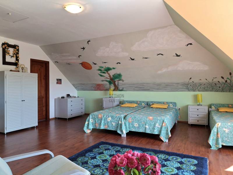 ÖRÖKPANORÁMÁS, BELTERÜLETI ÉS STRANDKÖZELI CSALÁDI HÁZ, NYARALÓ BALATONSZEPEZDENBalatonszepezd szepezdfürdői részén ajánlom figyelmébe ezt ritkaságnak számító ingatlant!Belterületi elhelyezkedése mellett elvehetetlen BALATONI PANORÁMÁVAL rendelkezik, pár percre a településrész strandjától és horgásztelepétől.Azonnal költözhető belső tér és szeretettel gondozott hangulatos kert teszi még vonzóbbá!KIEMELT MEGBÍZÁS, CSAK AZ OTTHON CENTRUM KÍNÁLATÁBAN!Már a ház külső megjelenése is a Balaton hangulatát árasztja : jellegzetes terméskő lábazat, többszintes kialakítás nagy terasszal.A szuterénszinten a garázs mellett vizesblokkal rendelkező tároló került kialakításra,de a garázs előtti térkövezet behajtó is kényelmes parkolást biztosít.A közel 50 m2 alapú szintek kialakítása a család igényeihez lett tervezve, de könnyen módosítható. Állandó lakhatásra, de nyaralónak is tökéletes választás.A FÖLDSZINTEN az amerikai konyhás nappali mellett hálószobát és egy tágas fürdőt találunk.Időnk nagy részét biztos hogy a napsütötte nappaliban vagy a hozzá kapcsolódó teraszon töltenénk.A félig tető alatt lévő 26 m2- es teraszról rabul ejtő panoráma nyílik a Balatonra és a parti fasorra, a családi étkezések és a pihenés helye.A külön fürdővel rendelkező EMELETEN nem tagolták szét a teret szobákra, kettő hálószoba kialakítható.Az erkélyről a Balaton víztükrének látványát kiegészíti az előttünk elterülő kert színpompája.Az emeletre vezető lépcső kényelmes kialakítású és biztonságos.MŰSZAKI JELLEMZŐI TEKINTETÉBEN:- tégla építésű, cserép héjazattal ( Bramac )- a fűtését mennyezeti infra fűtés és a kandalló biztosítja- REHAU nyílászárók redőnnyel és szúnyoghálóval- 2004- ben épült, folyamatosan karbantartott- hűtését klíma biztosítja- 3 fázis és a riasztórendszer bekötve- az utcában található gázon kívül minden közmű bekötveA kert ideális 936 m2, sövénnyel teljesen körbeültetett. A ház háta mögött kerti zuhanyt találunk.Az öntözéshez esővizet gyűjtő ciszterna biztosított.A színpompás virágok (rózsa, levendula...) mellett fügefa, fekete berkenye és díszcserjék ékesítik a kertet.Egy szép kert megnyugtató hatását vagy a Balaton közelségét, panorámáját és illatát hiába próbálnám nagy szavakkal leírni... nem lehet.Az ingatlan tehermentes, hitelezhető és rövid időn belül birtokba vehető, budapesti lakás beszámítása lehetséges.Ha kérdése merülne fel vagy szeretne időpontot egyeztetni a személyes megtekintésre, várom megtisztelő hívását a megadott elérhetőségeken! |