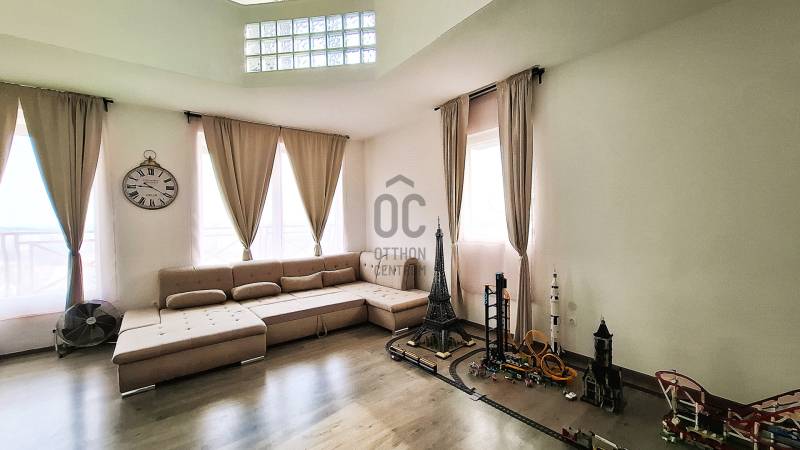 Eladó Csillaghegy legnagyobb és legkarakteresebb rezidenciája. Ez az ingatlan azoknak szól, akik nem érik be a tucatmegoldásokkal: texasi léptékű terek, zavartalan nyugalom és egy olyan panoráma várja, amit soha senki nem építhet el Ön elől.Amiért ez a birtok egyedülálló:Tökéletes Szeparáció és Nyugalom: Az ingatlan egy átmenő forgalomtól mentes, csendes zsákutcában található. Itt nincs zaj, csak a privát szféra és a biztonság.Elvehetetlen Örökpanoráma: A felső szintekről lélegzetelállító kilátás nyílik a környékre – ez a látvány minden nap ajándék.Rugalmas kialakítás, egybe is nyitható , de akár 6 lakás is kialakítható. Mivel a ház két telken helyezkedik el, így társasházzá alapítás is opció.Fent: Két hatalmas, felújított, modern lakás, különleges, átriumokkal, amik nagyvonalú tereket biztosítanak. Mind a két lakás a konyha-étkező valamint nappali mellett három hálószobával rendelkezik a felső szinten. A nagyobbik lakásnak alul még vendégszobája is van.Középen: 2 jó átlagos állapotú, teraszos nappali + 1 illetve nappali +2 hálós lakás, ideális önálló lakásnak, vendégeknek vagy irodának.Lent (Kertszint): További 2 lakás kialakítható, melyek közvetlen kertkapcsolattal rendelkeznek , de tökéletes wellness részlegnek vagy bérbeadásra, vállalkozásnak.Parkolás: A 3 garázs biztosítja a parkolást, de további beállók kialakítására is van lehetőség.Kinek ajánlom ezt a lehetőséget?Ez a „Dallas-stílusú” ingatlan páratlan választás nagycsaládosoknak, akik több generációt költöztetnének egy fedél alá, de kiváló befektetés is társasházasításra, vagy reprezentatív cégközpontnak/magánklinikának. |