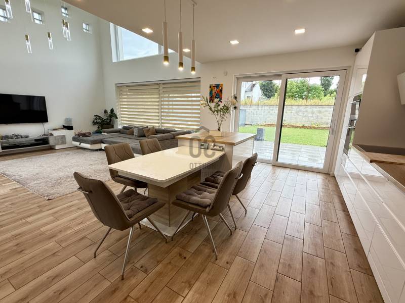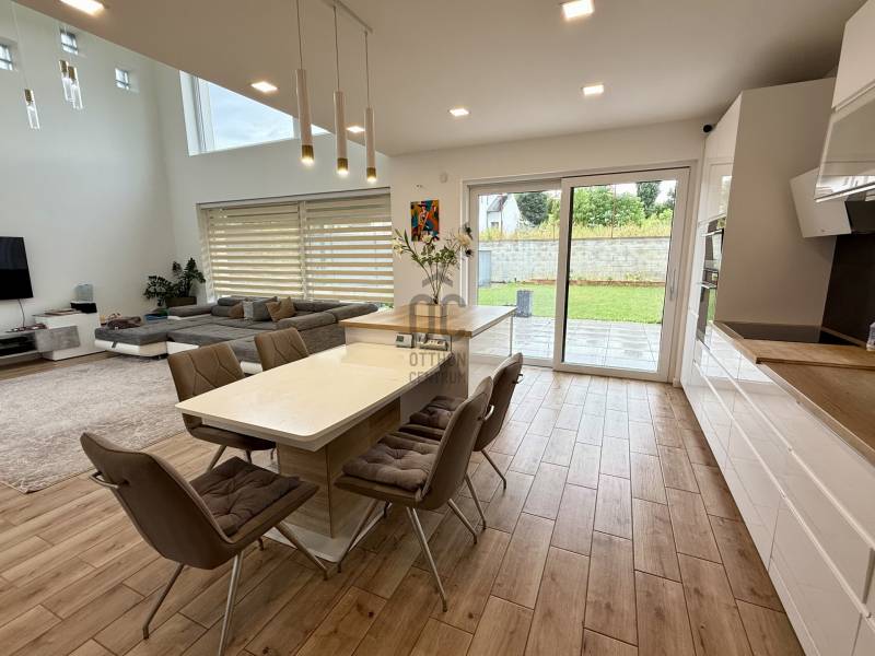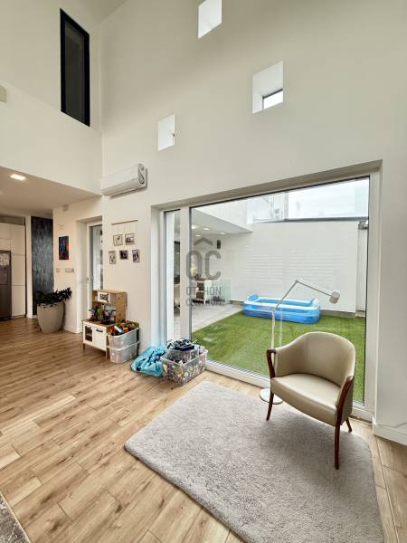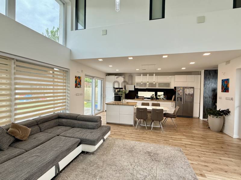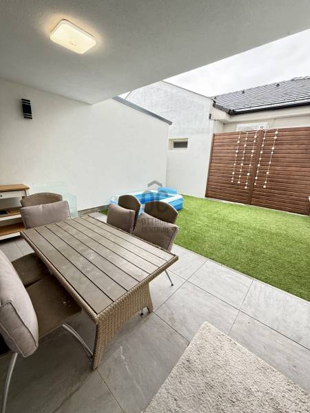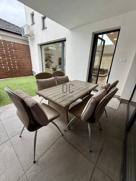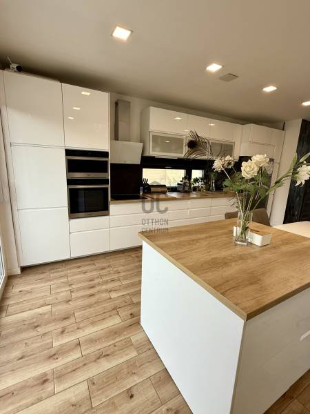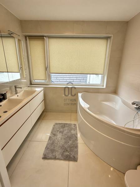 Remek lehetőség családosok számára Üröm csendes, de mégis jól megközelíthető részén!Az átgondolt kialakítású, 2021-ben épült, kétszintes ikerház tágas, nagy belmagasságú amerikai-konyhás nappalija, hatalmas üvegfelületei különleges hangulatú otthont teremtenek.Tökéletes választás lehet minden olyan család számára, akik a kényelmet és a modern életvitel előnyeit keresik. A házban található 2 fürdőszoba, mosókonyha garantálja a kényelmes mindennapokat, míg a tágas nappali és a konyhaszigetes amerikai konyha ideális teret biztosít a közös családi pillanatokhoz. A prémium kivitelezés és a beépített bútorok, szekrények biztosítják, hogy Önnek csak be kelljen költöznie.A ház rezsije nagyon kedvező, melyet a hőszivattyús fűtés , a napelem rendszer, a klímák biztosítanak. A hangulatvilágítás valamint a hatalmas üveg felületek pedig a modern otthonok elvárásainak megfelelően varázslatos atmoszférát teremtenek. A nagy belmagasság és a világos terek garantálják, hogy minden szoba napfényben úszik, így az otthon valódi oázissá válik.A különleges beosztású ház nappalija két irányban is kertkapcsolatos, az egyik belső átriumos, intim, és minden időjárásban praktikusan használható mert félig fedett, míg a ház mögött egy terasz kapcsolatos nagyobb kert került kialakításra, ahol még egy kis játszótér is helyet kapott. Automata öntözőrendszer gondoskodik a szép zöld kert fenntartásáról, míg a kerti tároló praktikus megoldást kínál a kinti eszközök és bútorok tárolására. Az elektromos autó töltés lehetősége is adott, így a környezettudatos életmód híveinek is ideális megoldást nyújt.A havi bérleti díjon felül fix 65 ezer forint a havi rezsi átalányban. Ebben benne van az áramfogyasztás, fűtés, hűtés, víz, csatornadíj, szemétszállítás.A környék nyugodt, családbarát légkörével, valamint a közeli játszóterek és parkok révén ideális helyszínt biztosít a gyermekek számára a szabadban való játékhoz. A közlekedés szempontjából is kedvező helyzetben található, hiszen a közeli buszmegállók és a könnyen elérhető autóutak révén Budapest belvárosa gyorsan és kényelmesen megközelíthető. Üröm egyre népszerűbb választás a családok körében, hiszen a város zöldövezete és csendes utcái ideális hátteret nyújtanak a mindennapi élethez. Amennyiben felkeltette érdeklődését ez a kivételes ingatlan, kérem hívjon! |