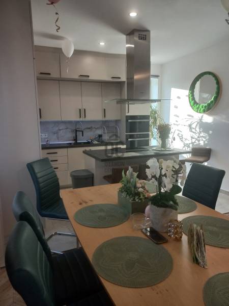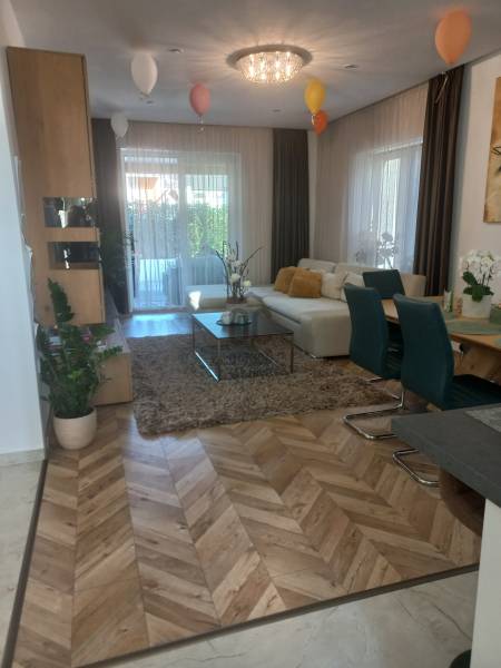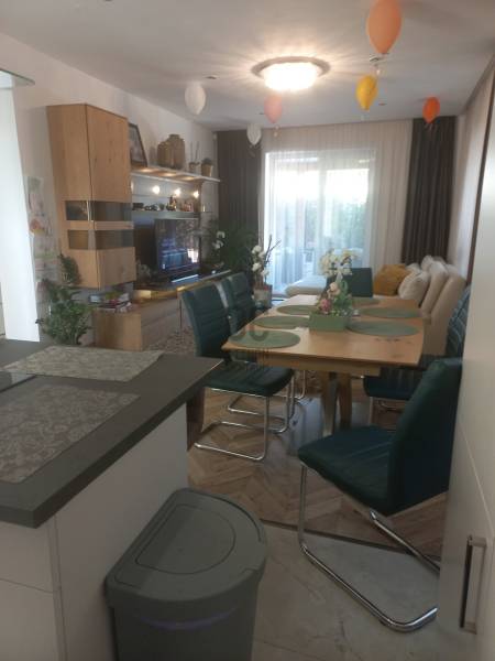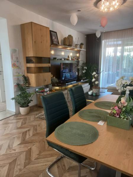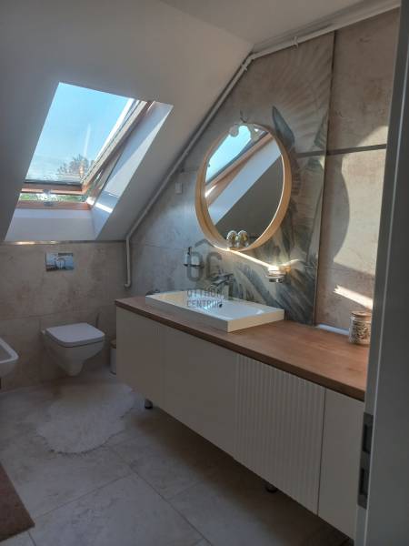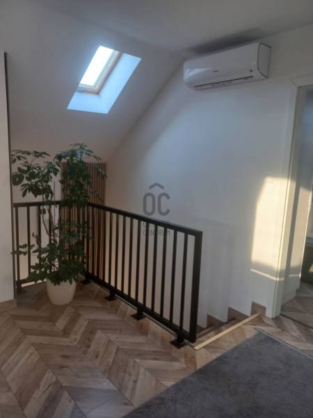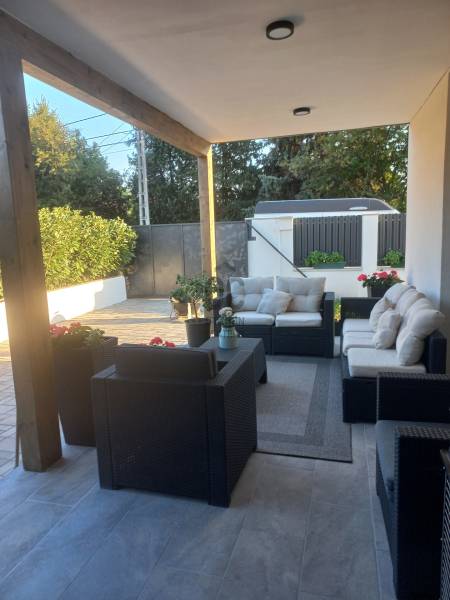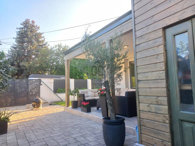 Mediterrán életérzés otthonában - hangulatos, igényes ikerházfél Dunaharaszti csendes utcájábanBudapesthez közel, Dunaharaszti csendes utcájában eladó egy igényesen, teljeskörűen felújított 127 m2-es, 5 szobás iházrész 280 m2-es saját használatú telekkel.A központi rész a nagyméretű, amerikai konyhás, étkezős nappali nagy ablakokkal.Az alsó szint része ezen kívül a tágas előszoba egy hálószoba és a fürdő- WC-vel, valamint a nagyméretű fedett terasz.A felső szinten 3 szoba és egy nagyobb fürdőszoba található.A házrész szigetelt, minőségi burkolatokkal, 3 rétegű műanyag nyílászárókkal.A fűtés gáz cirkóval megoldott, az alsó szinten padlófűtéssel, fent pedig radiátoros hőleadással.A nyári melegben a hűtésről 2 db klíma gondoskodik.A kert mediterrán jellegű növényekkel betelepítve a nyugalom szigete.A nagyméretű teraszon jól esik a reggeli kávé és megfelelő a hely családi vagy baráti összejövetelekre is.A gépkocsik részére két beálló is van, de a ház előtt is meg lehet állni, akár több autóval is.Tartozik a házrészhez két külső és egy belső tároló is.Közlekedés szempontjából a távolsági busz megállója kb 10 perces sétára, iskolák, óvoda, bölcsőde is belátható távolságon belül.Stílusos megjelenés, mediterrán életérzés.Ideális nagyobb családnak is.Hívjon, nézzük meg, találja meg benne új otthonát.#Dunaharaszti #nagy család #mediterrán stílus #kiváló minőség |
