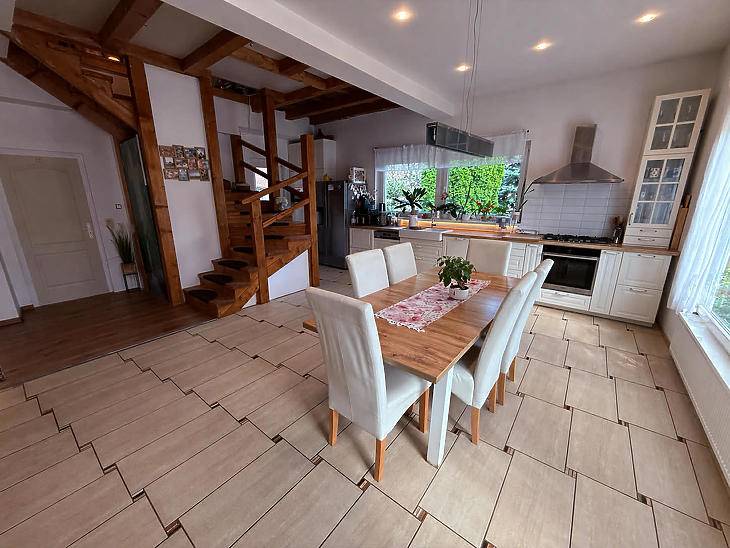 Eladásra kinálunk Dunakeszi családi házas övezetében, nyugodt és kellemes környezetben egy 2009-ben épült, jó állapotú családi házat.Az ingatlan praktikus elosztású: a földszinten előszoba, vendégfürdőszoba, egy tágas, étkezős konyha, nappali, valamint két szoba található, amelyekhez közvetlen kapcsolattal egy további fürdőszoba is tartozik. A konyhaból közvetlen kijárat nyílik a 35 nm-es teraszra, amely ideális helyszíne a pihenésnek vagy baráti összejöveteleknek. Az emeleten közlekedő és három külön nyiló szoba került kialakításra, így a ház ideális nagyobb család számára is. A fütést kondenzációs kazán biztosítja, a hidegburkolatos helyiségekben padlófűtéssel, míg a többi helyiségben radiátoros hőleadással. A 10 cm-es szigetelésnek köszönhetően a ház fenntartási költsége kedvező. A dél-nyugati fekvésnek köszönhetően a ház egész nap világos, napfényes. A közel 895 nm-es, rendezett, saját használatú kert további lehetőségeket rejt. A telek hátsó részén egy különálló melléképület található, amely jelenleg félkész állapotban van, azonban tetőszerkezete már elkészült és megfelelő állapotú, így befejezése az új tulajdonos elképzelései szerint valósítható meg. Ugyanitt helyezkedik el egy szerelőaknás, körülbelül 40 nm-es garázs, valamint egy 16 nm-es pince is. A telken belül további 3-4 autó parkolása biztosított viacolorral burkolt területen. Az ingatlan elhelyezkedése kiváló: az M2 autóút autóval néhány percen belül elérhető, a Volán buszmegálló pedig rövid sétatávolságra található. A közelben minden fontos infrastruktúra rendelkezésre áll, többek között üzletek, orvosi rendelő, curászda, iskola, óvoda és gyógyszertár. |
